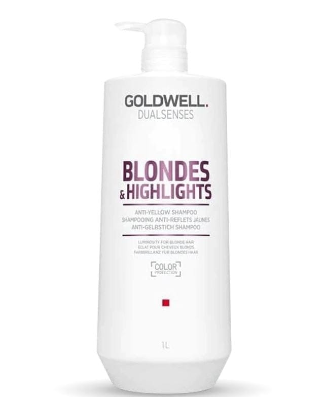 Goldwell Dualsenses Blondes and Highlights Big Bottle Trio Bundle includes a shampoo, conditioner, and treatment that bring out color luminosity, neutralize unwanted yellow tones, and regenerate hair instantly for luminous blonde color reflections.