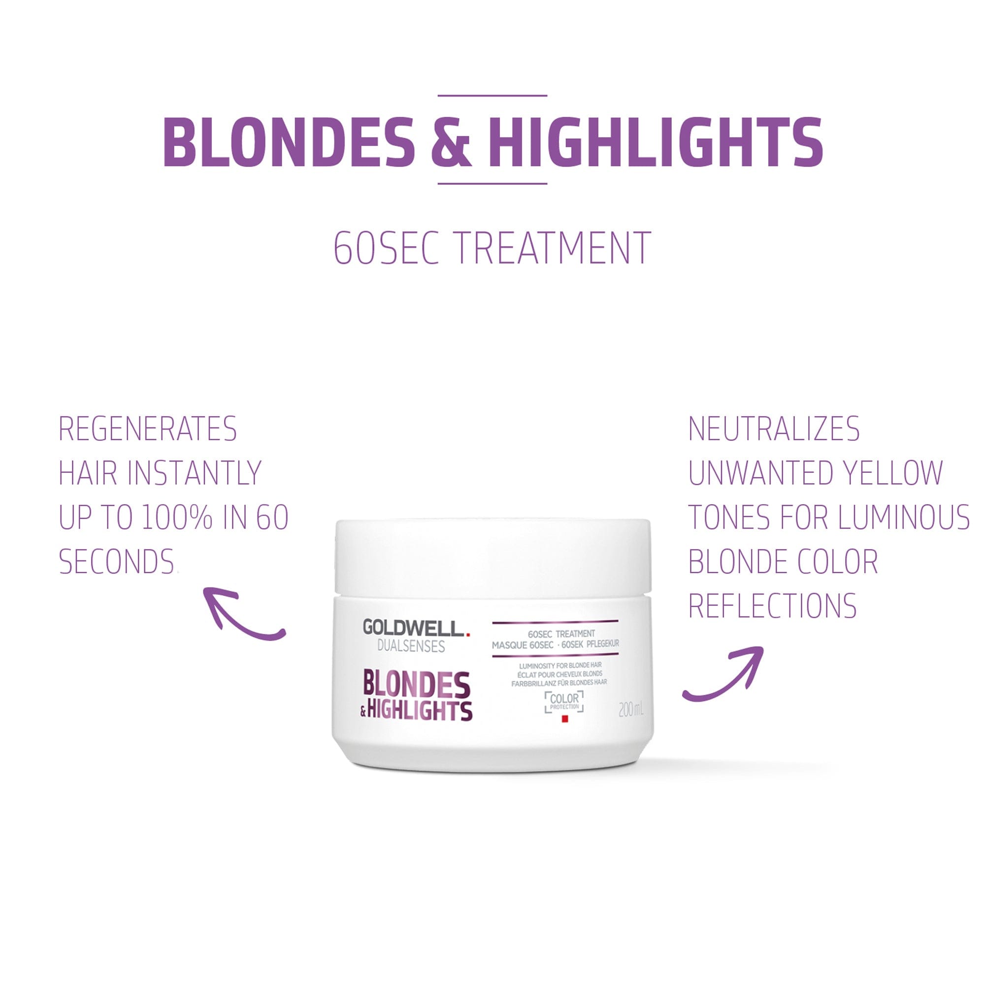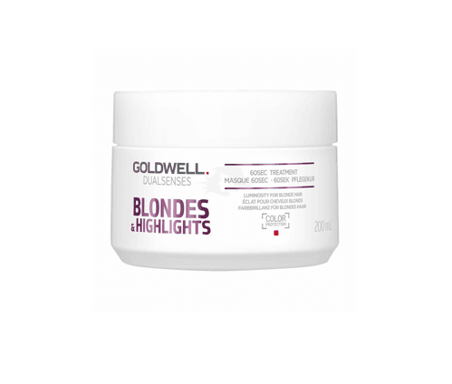 Goldwell Dualsenses Blondes & Highlights 60 Second Treatment 200ml provides instant regeneration for blonde hair while neutralizing unwanted yellow tones for luminous blonde color reflections.