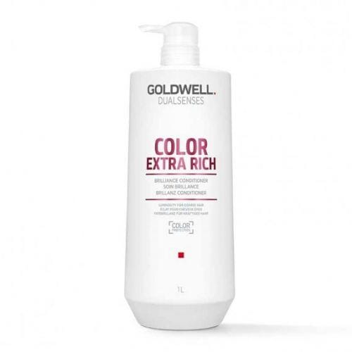 Goldwell Dualsenses Color Extra Rich Big Bottle Trio Bundle includes Goldwell Dualsenses Color Extra Rich Brilliance Shampoo 1000ml, Goldwell Dualsenses Color Extra Rich Brilliance Conditioner 1000ml, and Goldwell Dualsenses Color Extra Rich 60 Second Treatment 500ml, providing luminosity and nourishing care for colored and non-colored coarse hair.