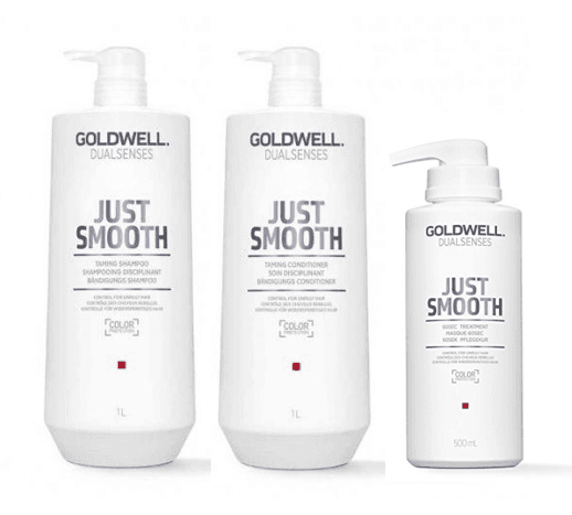 Goldwell Dualsenses Just Smooth Big Bottle Trio Bundle contains a taming shampoo, conditioner, and 60-second treatment that provide control for unruly hair, instant manageability and frizz control, and nourishment for smooth and touchably soft hair.