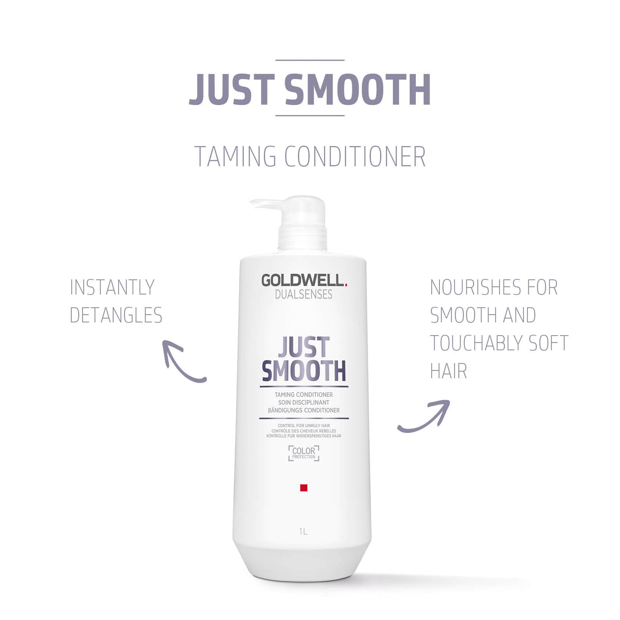 Goldwell Dualsenses Just Smooth Taming Conditioner detangles, nourishes, and tames unruly hair for a smooth, polished look.
