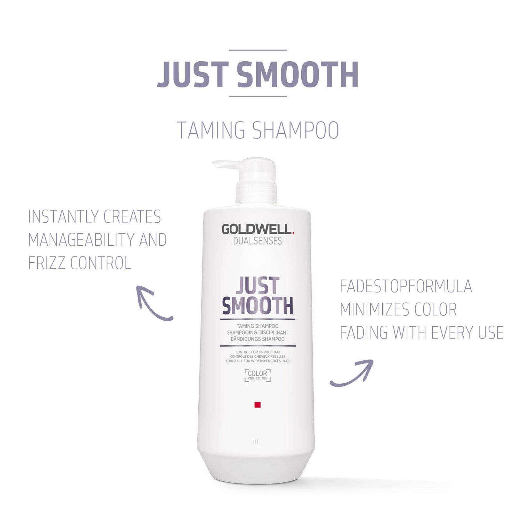 What are the benefits and features of Goldwell Dualsenses Just Smooth Taming Shampoo 1000ml?