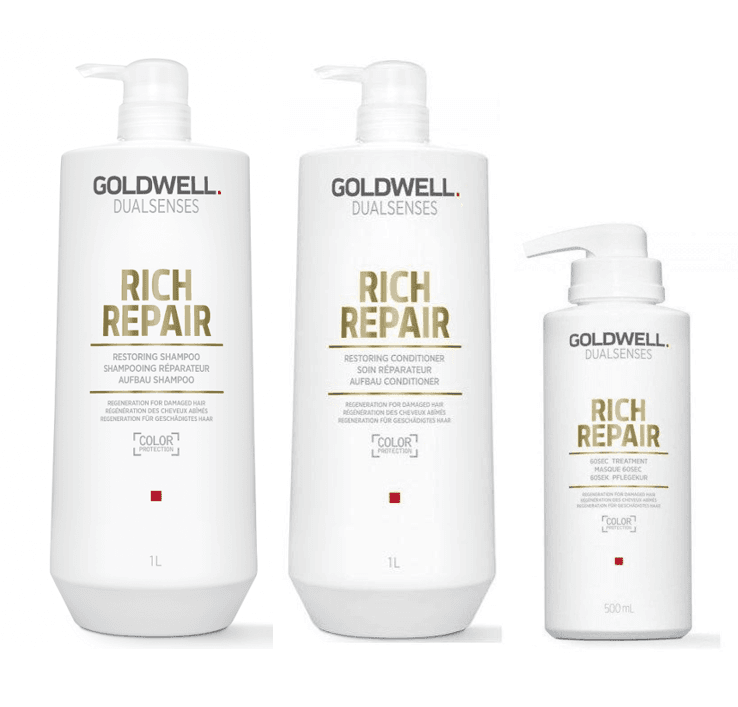 Goldwell Dualsenses Rich Repair Big Bottle Trio Bundle includes Goldwell Dualsenses Rich Repair Restoring Shampoo 1000ml, Goldwell Dualsenses Rich Repair Restoring Conditioner 1000ml, and Goldwell Dualsenses Rich Repair 60 Second Treatment 500ml.