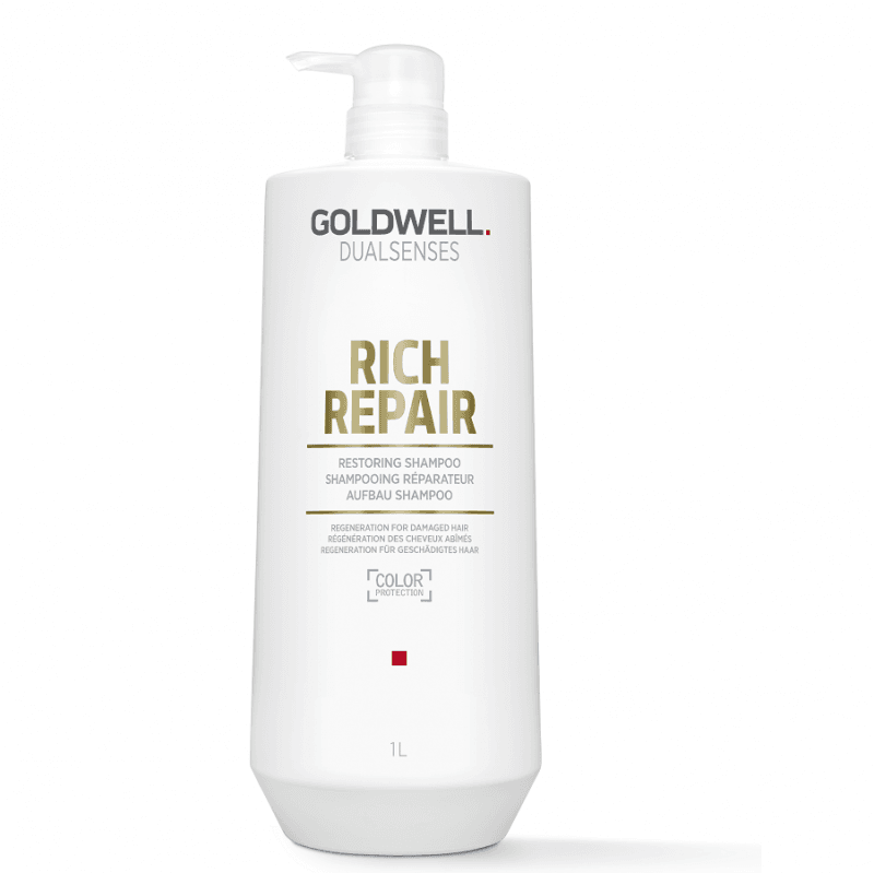 Goldwell Dualsenses Rich Repair Restoring Shampoo 1000ml instantly reconstructs and reawakens the shine of natural hair, while its unique FadeStopFormula minimizes color fading with every use. Goldwell Dualsenses Rich Repair Restoring Conditioner 1000ml instantly increases combability and restores natural elasticity, effectively reducing hair breakage. Goldwell Dualsenses Rich Repair 60 Second Treatment 500ml is perfect for dry and damaged hair, as it instantly restores severely damaged hair structures from deep inside, rebuilds the hair fiber up to 100% in 60 seconds, and ensures a healthy hair feeling.