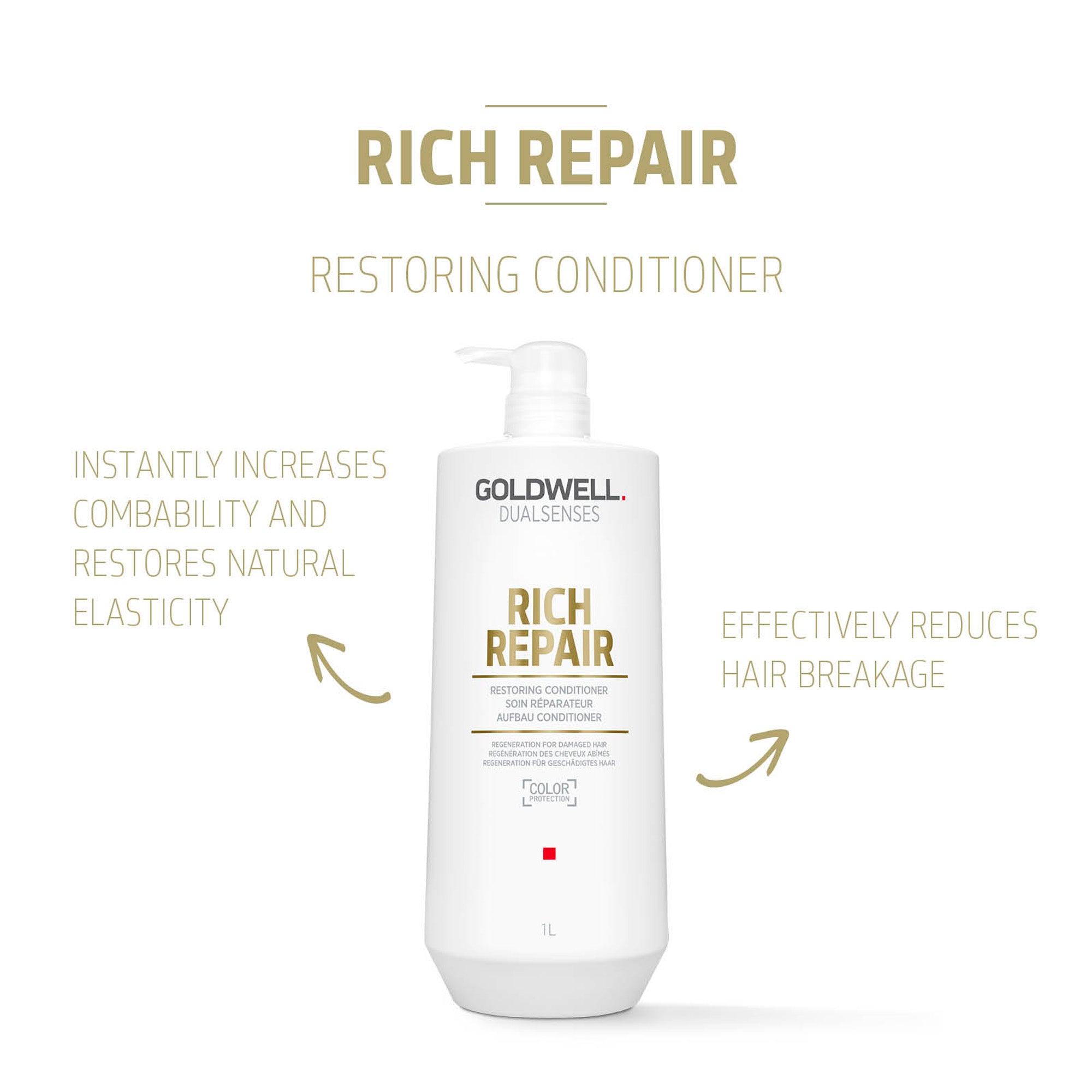 Goldwell Dualsenses Rich Repair Restoring Conditioner 1000ml instantly increases combability and restores elasticity, reducing breakage for damaged hair. Benefits include deep care, nourishment, healthier, and more resilient hair. Ideal for restoring natural beauty and manageability.