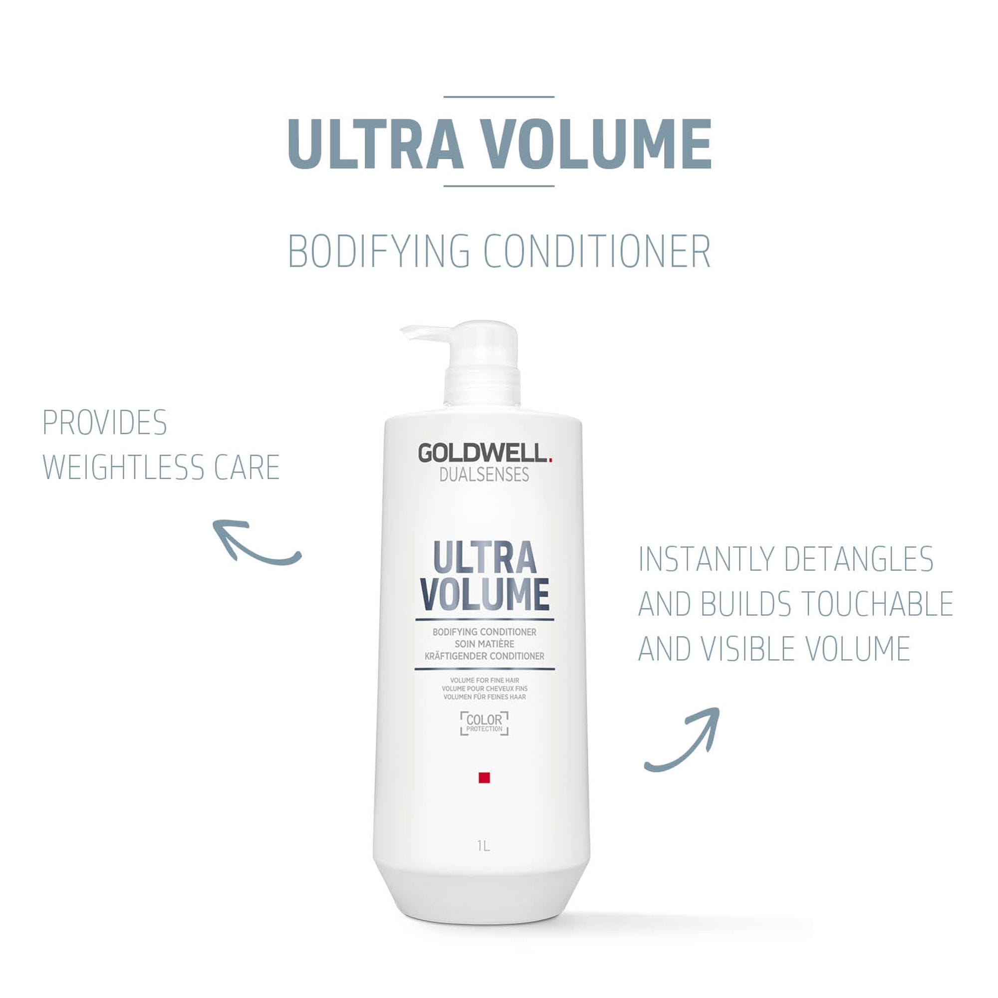 Goldwell Dualsenses Ultra Volume Bodifying Conditioner 1000ml is a weightless conditioner that instantly detangles and builds touchable and visible volume for fine to normal hair.