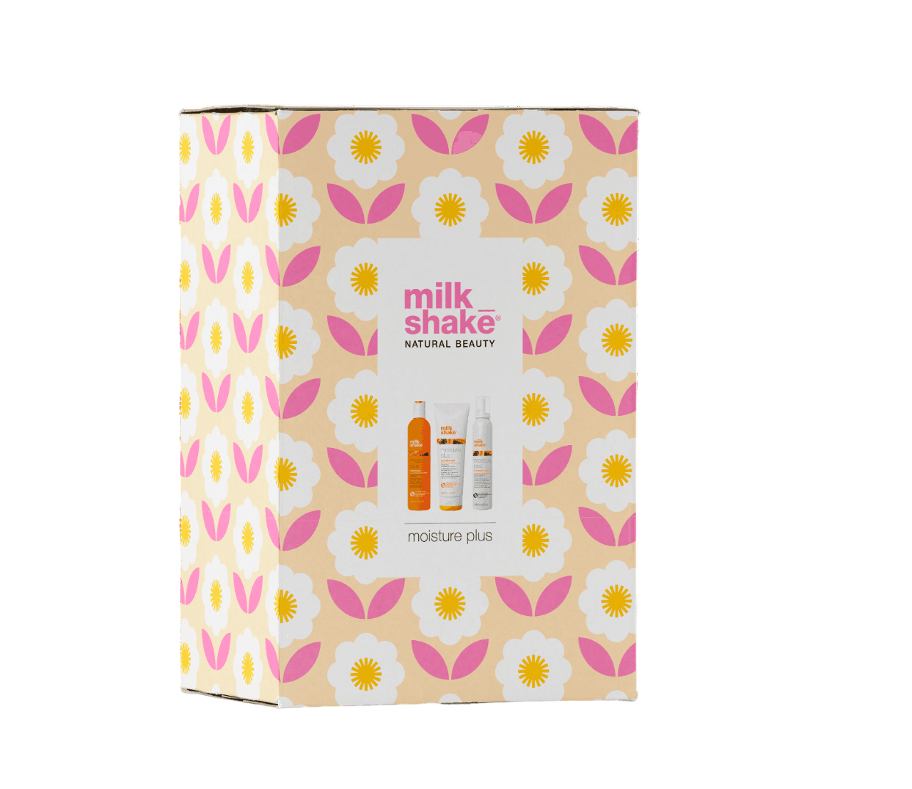 The milk_shake Moisture Plus Trio Pack includes a Moisture Plus Shampoo, Moisture Plus Conditioner, and Moisture Plus Whipped Cream to provide intense hydration and nourishment to dry and damaged hair.