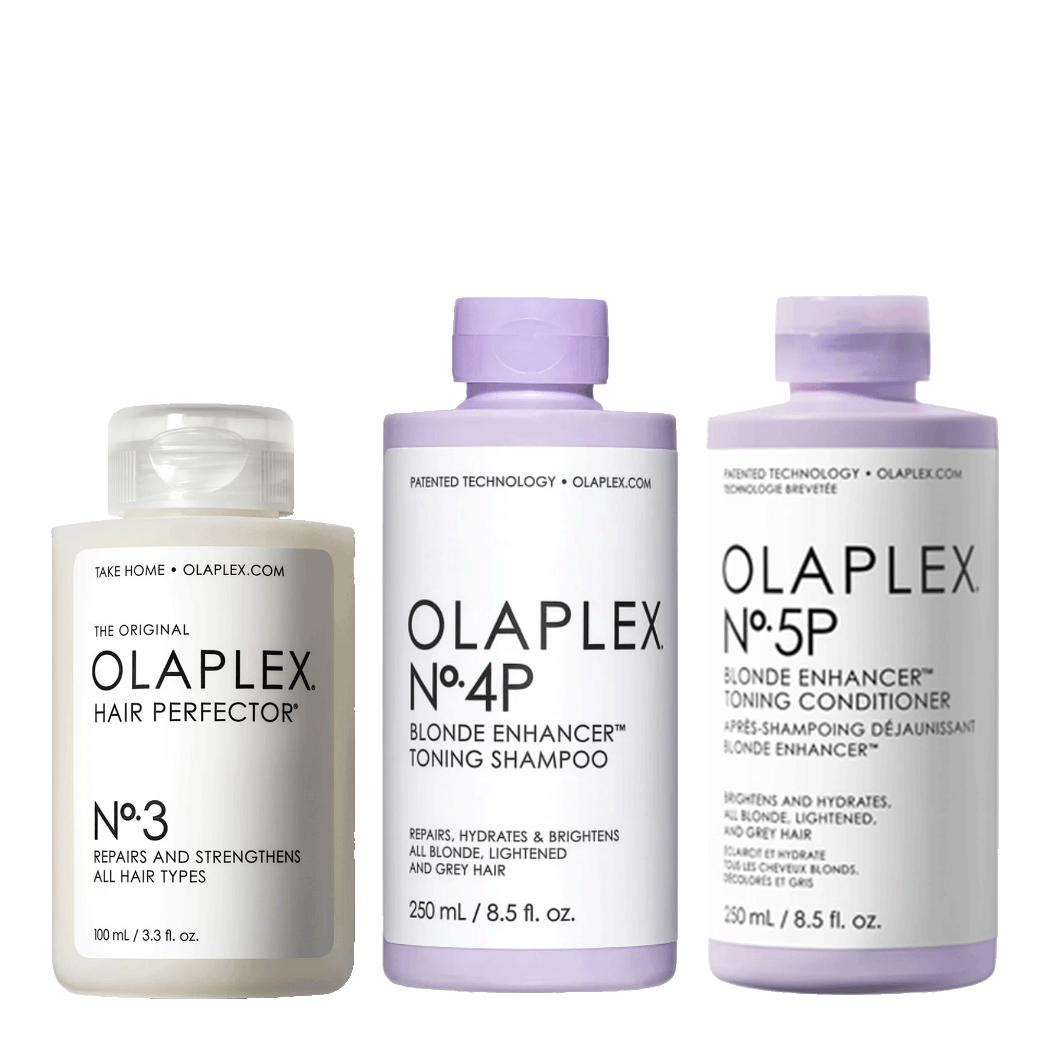 This Olaplex Blonde and Grey Hair Strengthening Bundle includes three essential products that work together to strengthen and enhance blonde and grey hair.