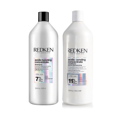 The Redken Acidic Bonding 1L Shampoo and Conditioner Bundle includes the Redken Acidic Bonding Concentrate Shampoo and Conditioner, formulated to repair the bonds in damaged hair for stronger, healthier hair with reduced breakage and split ends, plus a smoother feel.