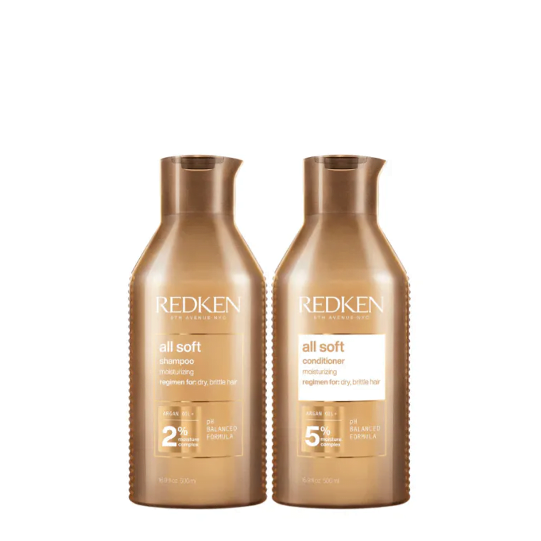 The Redken All Soft Shampoo and Conditioner 500ml Bundle includes Redken All Soft Shampoo 500ml and Redken All Soft Conditioner 500ml, both formulated with Redken’s Moisture Complex with Argan Oil to soften and moisturize hair from root to tip.