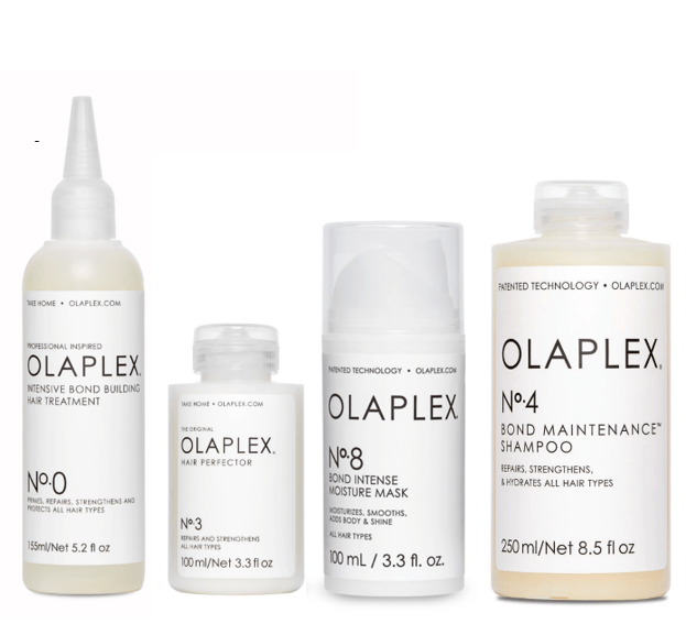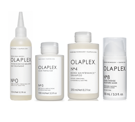 This bundle contains four products: Olaplex No.0 Intensive Bond Building Hair Treatment 155ml, Olaplex No.3 Hair Perfector 100ml, Olaplex No.4 Bond Maintenance Shampoo 250ml, and Olaplex No.8 Bond Intense Moisture Mask 100ml.